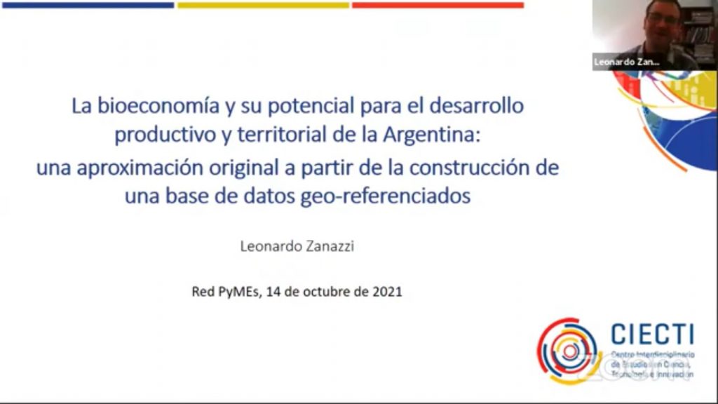 Los días 13, 14 y 15 de octubre se realizó la 26° Reunión Anual de Red Pymes Mercosur, coorganizada en esta oportunidad por la Red Pymes, la Universidad Nacional de los Comechingones y el International Council for Small Business. En este marco se llevó a cabo el panel “Bioeconomía y desarrollo regional de triple impacto: Las PYMES en la reconfiguración del mapa socio-productivo de Argentina”, presentado por Miguel Lengyel (Ministerio de Ciencia y Tecnología). En este espacio Leonardo Zanazzi -investigador CIECTI- realizó la presentación “La bioeconomía y su potencial para el desarrollo productivo y territorial de la Argentina: una aproximación original a partir de la construcción de una base de datos geo-referenciados”. Participaron también del panel María Rosa Murmis (MAGyP) y Gabriel Delgado (INTA, IICA).